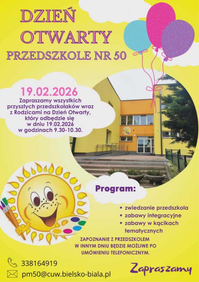 Zapraszamy przyszłych przedszkolaków wraz z Rodzicami na Dzień Otwarty Przedszkola nr 50, który odbędzie się 19 lutego 2026 r. w godz. 9:30–10:30. To doskonała okazja, by poznać naszą placówkę i spędzić miło czas. ✨🎈