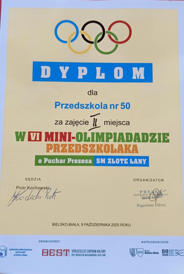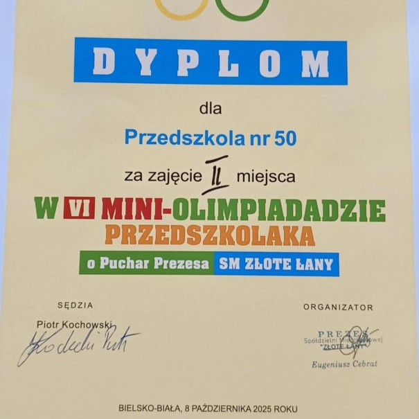 Każdy uczestnik otrzymał medal, a wszystkie dzieci wróciły z uśmiechem i pamiątkowym dyplomem. Gratulujemy wszystkim małym olimpijczykom i dziękujemy za wspaniałą zabawę.